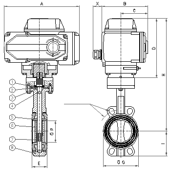 D971X-6/10/16對夾式電動軟密封蝶閥主要外形連接尺寸 單位:mm